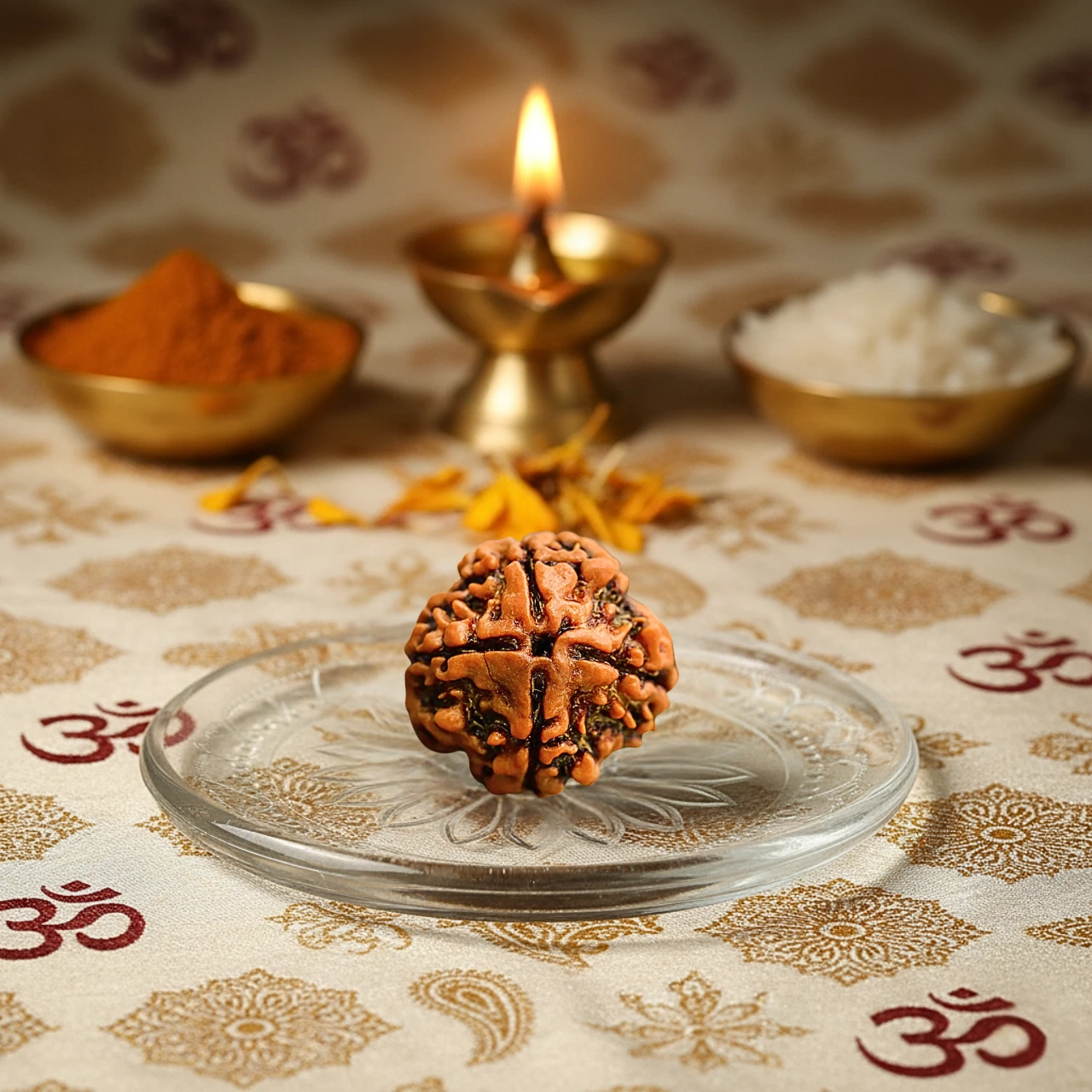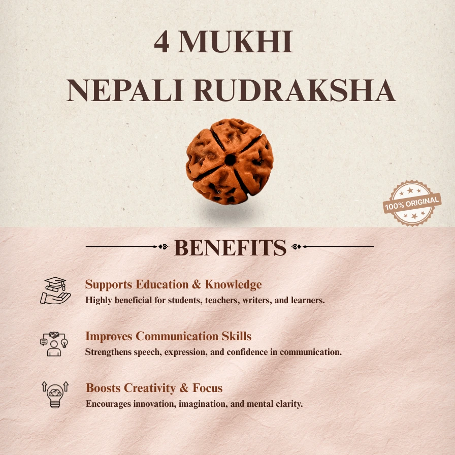 The 4 Mukhi Rudraksha, associated with Lord Brahma, represents creativity, wisdom, and knowledge. It enhances intellectual abilities and supports individuals in gaining clarity and focus.